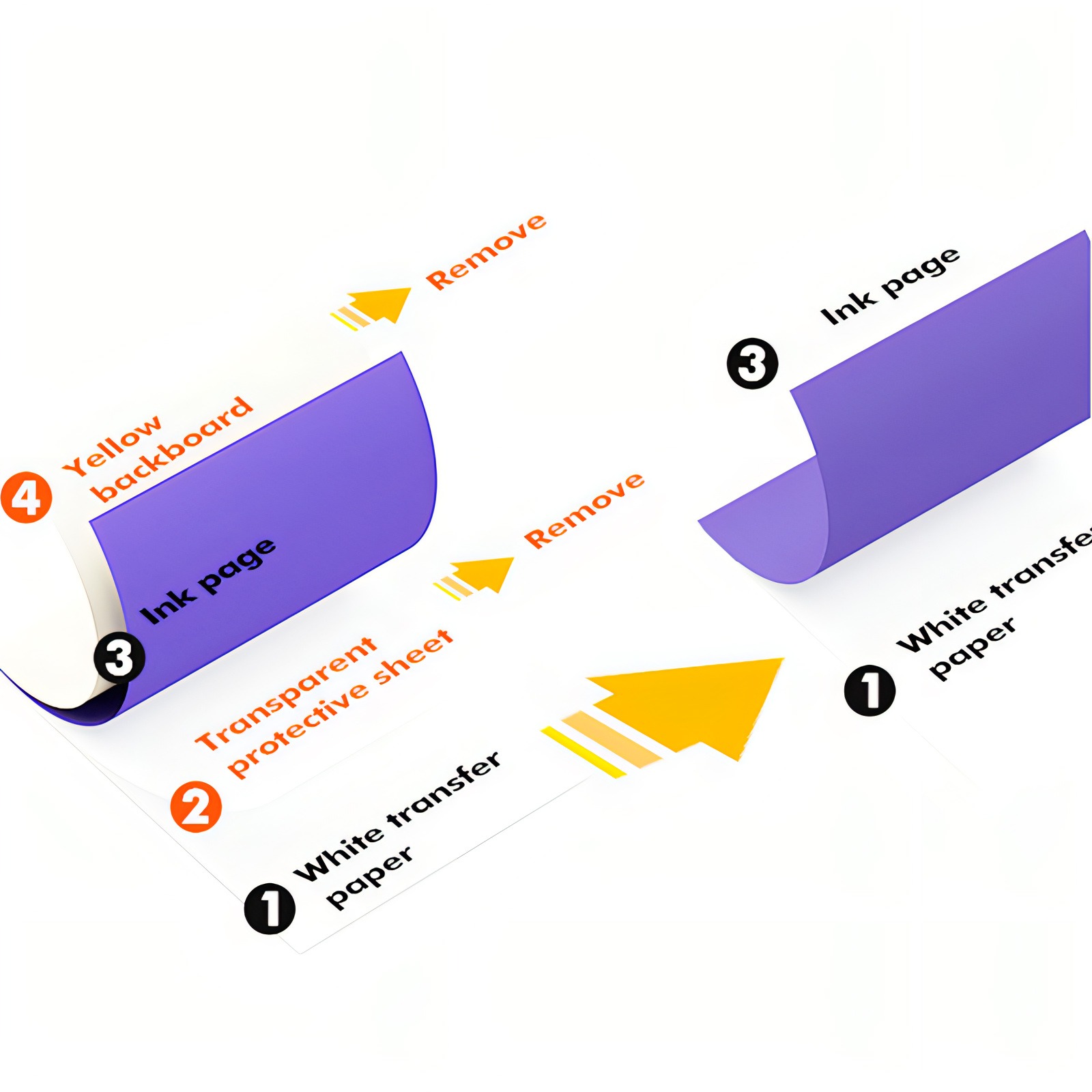Remove the transparent protective film and yellow backing plate, leaving the white transfer paper and ink page.